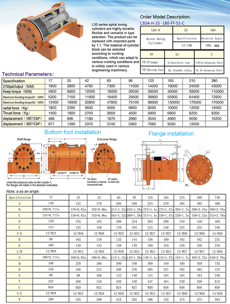 L30系列螺旋擺動(dòng)油缸具有高度的經(jīng)久耐用,選型靈活通用,本產(chǎn)品與進(jìn)口件可以1:1復(fù)換使用,并根據(jù)工況可以選擇缸體材質(zhì),適應(yīng)各種工況條件。